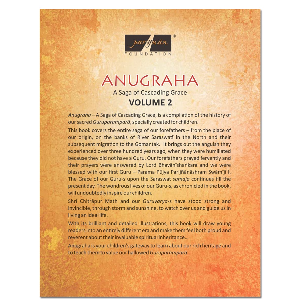 Anugraha - A Saga of Cascading Grace narrates the inspiring saga of the Chitrapur Saraswat Guru Parampara, beginning in Kashmir, where the Saraswats originated, and continuing to the present day, where we are blessed with H.H. Shrimat Sadyojat Shankarashram Swamiji, the 11th Mathadhipati of Shri Chitrapur Math.