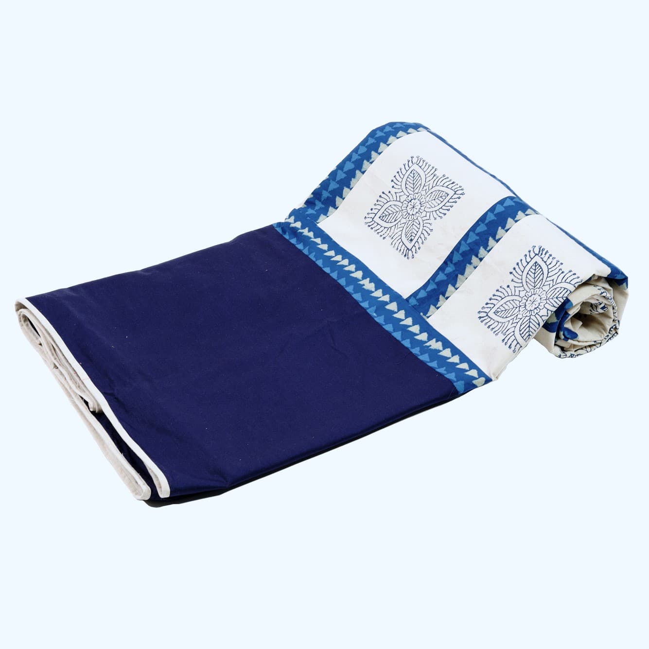 Indulge in the beauty of handcrafted artistry with our exclusive king-size handblock printed and patchwork bedcover. It is meticulously crafted using traditional techniques, resulting in intricate outcomes and vibrant colours. The design adds a unique element to your bedroom, while the soft and breathable cotton ensures a comfortable night's sleep.