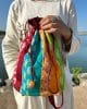 This vibrant multicoloured batwa bag is crafted from cotton fabric strips, combining sustainability with style. Featuring convenient drawstrings, a long shoulder strap, and a secure inner pocket, it’s the perfect eco-friendly accessory for carrying your essentials with a unique, handcrafted touch.