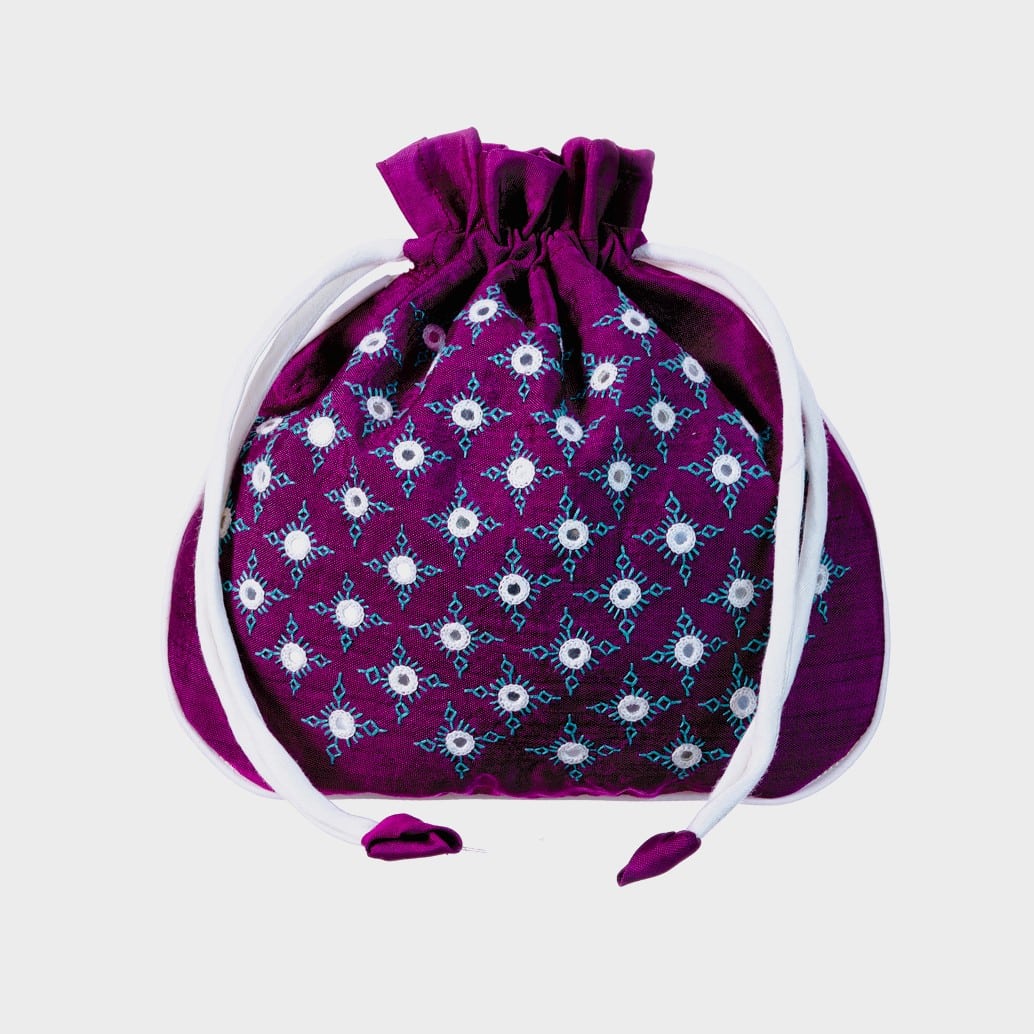 Inspired by the intricate mirror work of Kutch and the delicate Kasuti embroidery of Dharwar, this mini drawstring bag is a true work of art. Crafted from pure silk, it has detailed embroidery and shimmering mirror embellishments. Make it a memorable gift this festive season.