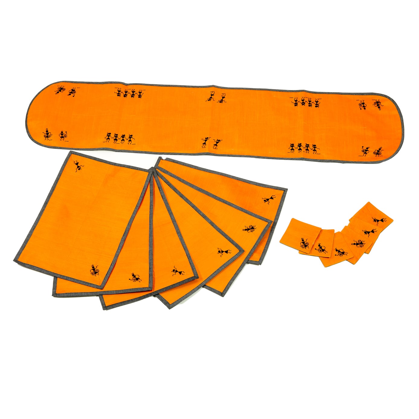 Welcome traditional Indian art to your dining experience with our exquisite table linen set. Hand-embroidered in cotton silk, it features a stunning table runner, six table mats, and six coasters, all decorated with intricate Warli patterns, inspired by the ancient tribal art form of Maharashtra.
