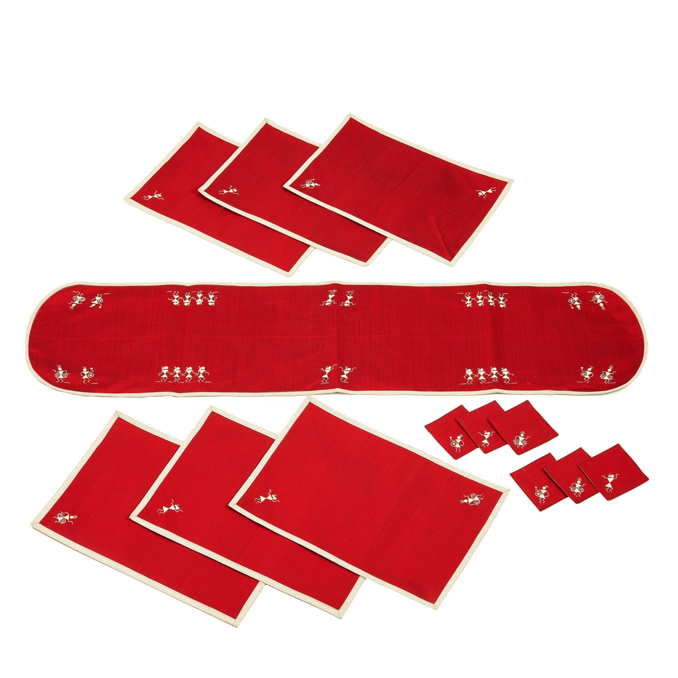 Welcome traditional Indian art to your dining experience with our exquisite table linen set. Hand-embroidered in cotton silk, it features a stunning table runner, six table mats, and six coasters, all decorated with intricate Warli patterns, inspired by the ancient tribal art form of Maharashtra.